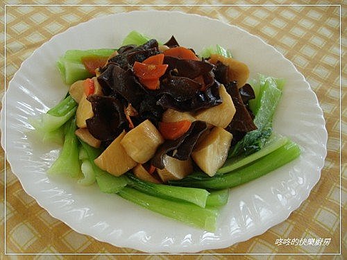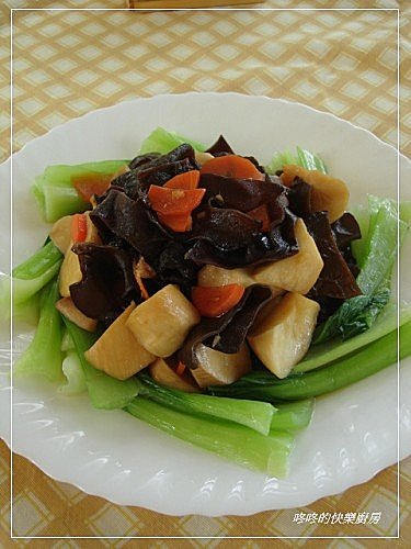 加油及鹽川燙後,先放在盤子上,再將炒好的木耳杏鮑菇放上,就變成一道好看又好吃的菜囉!