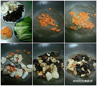 食材:乾燥的木耳.杏鮑菇.紅蘿蔔1/3條.青江菜.薑末